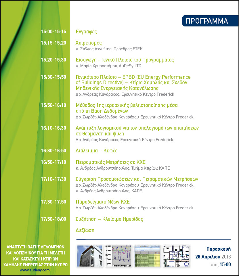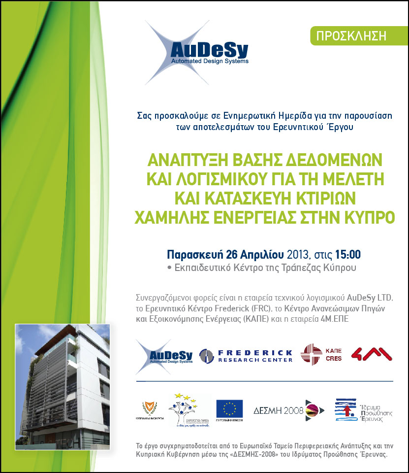 Την Παρασκευή 26 Απριλίου, πραγματοποιήθηκε με μεγάλη επιτυχία Ημερίδα Διάχυσης με σκοπό να παρουσιαστούν τα αποτελέσματα του ερευνητικού έργου. Την ημερίδα χαιρέτησε ο Πρόεδρος του Τεχνικού Επιμελητηρίου Κύπρου κ. Στέλιος Αχνίωτης ο οποίος τόνισε την σημασία ερευνητικών έργων όπως αυτό σε ένα τόσο σημαντικό για την Κύπρο θέμα όπως είναι τα κτίρια χαμηλής ενέργειας. Την ημερίδα παρακολούθησαν δεκάδες μηχανικοί. Ακολούθησε δεξίωση.
