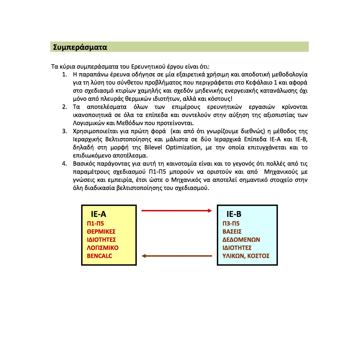 2. Εφαρμογή της διαδικασίας Bestest: Θα εφαρμοστεί η διαδικασία Bestest προκειμένου να επαληθευθεί η ακρίβεια και να διασφαλιστεί η ποιότητα του λογισμικού. 3. Λογισμικό Τμήμα Β. Τεχνικο-οικονομική Βελτιστοποίηση Η τεχνικο-οικονομική βελτιστοποίηση για δεδομένη αρχιτεκτονική του κτιρίου θα γίνει με βάση την κοστολόγηση της κατασκευής του, όπου εναλλακτικά θα προτείνονται και θα αξιολογούνται συγκεκριμένες δυνατότητες εξοικονόμησης ενέργειας. Το λογισμικό σε συνδυασμό με τη Βάση Δεδομένων θα προτείνει αυτόματα με αφετηρία την μόνωση του κτιρίου μέτρα μείωσης των ενεργειακών απαιτήσεων π.χ. σταδιακή αύξηση της θερμικής μάζας του κελύφους του κτιρίου, σταδιακή αύξηση της μόνωσης της οροφής, αύξηση της εξωτερικής, εσωτερικής, ή εσωτερικής και εξωτερικής μόνωσης των εξωτερικών τοίχων του κτιρίου, σταδιακή αύξηση της θερμομόνωσης των κουφωμάτων, σταδιακή αύξηση της προστασίας από την ακτινοβολία, κλπ. Κάθε προτεινόμενο μέτρο συνεπάγεται συγκεκριμένες ενεργειακές απαιτήσεις, για την κάλυψη των οποίων το παραπάνω λογισμικό θα προτείνει πάλι αυτόματα συστήματα θέρμανσης, ψύξης και δροσισμού, με προτεραιότητα τις ανανεώσιμες πηγές ενέργειας, το κόστος των οποίων θα συμπεριλαμβάνεται στη παραπάνω κοστολόγηση της κατασκευής. Συγχρόνως δε, θα υπολογίζεται και το λειτουργικό κόστος του κτιρίου μετά την αποπεράτωση του, και επομένως θα είναι δυνατή και η αποτίμηση του χρόνου ανάκτησης της όποιας πρόσθετης επένδυσης, δηλαδή του ‘return of investment (ROI)’ σε σχέση με τη συμβατική κατασκευή (σύμφωνα με τον ισχύοντα Κυπριακό κανονισμό Θερμομόνωσης, κλπ.). Επειδή όλες οι παραπάνω μεταβλητές είναι διακριτές (κατασκευαστικοί και άλλοι λόγοι), θα εφαρμοσθούν μεθοδολογίες ιεραρχικής βελτιστοποίησης με δυνατότητα κατάταξης των διαφόρων προτεινόμενων μέτρων/λύσεων με βάση π.χ. των επιπτώσεων τους στον ROI ή με άλλο κριτήριο. Η ανάπτυξη του λογισμικού θα είναι αποτέλεσμα της συνεργασίας του ΑΦ με τον ΣΦ3. Ο ΣΦ1 θα αναλάβει την εφαρμογή της διαδικασίας Bestest και θα ενημερώνει σχετικά τον ΑΦ και ΣΦ3. Ο ΣΦ1 σε συνεργασία με τον ΣΦ2 θα αναλάβουν την εφαρμογή της μεθοδολογίας ιεραρχικής βελτιστοποίησης και την ανάπτυξη των στρατηγικών σχεδιασμού. ΠαραδοτέαΠ10: Λογισμικό σε εκτελέσιμη μορφή Π11: Μεθοδολογία ιεραρχικής βελτιστοποίησης Με τη μορφή έκθεσης θα παρουσιαστεί αναλυτικά η εφαρμογή της μεθοδολογίας ιεραρχικής βελτιστοποίησης και θα παρουσιαστούν τα κριτήρια που αναπτύχθηκαν προκειμένου το προγράμμα να προτείνει αυτόματα λύσεις. Π12: Αποτελέσματα εφαρμογής της διαδικασίας Bestest. Με την μορφή έκθεσης θα περιγραφεί αναλυτικά η εφαρμογή της διαδικασίας Bestest και θα παρουσιαστούν τα αποτελέσματα της εφαρμογής