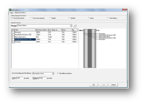 O χρήστης μπορεί να επιλέξει τα υλικά κατασκευής των δομικών στοιχείων στοιχείο (Εξωτερικός τοίχος, Εσωτερικός τοίχος, Οροφή, Δάπεδο, Δοκός, Υποστύλωμα) είτε από τις βιβλιοθήκες δομικών στοιχείων του προγράμματος είτε δημιουργώντας το δομικό στοιχείο χρησιμοποιώντας τις βιβλιοθήκες δομικών υλικών. Ο συντελεστής θεμοπερατότητας του δομικού στοιχείου υπολογίζεται αυτόματα από το πρόγραμμα.