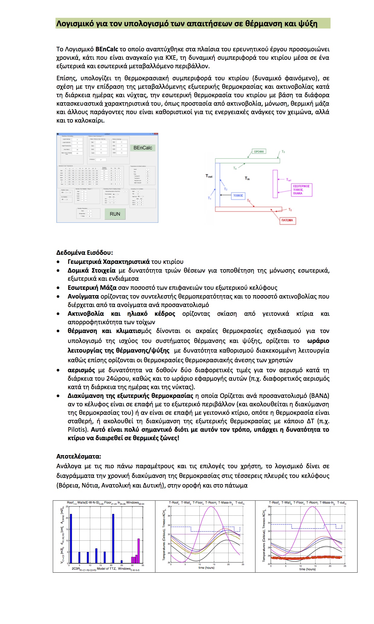 Οι δραστηριότητες για την ανάπτυξη του λογισμικού περιλαμβάνουν: 1. Λογισμικό Τμήμα Α. Απαιτήσεις θέρμανσης/ψύξηςΘα αναπτυχθεί ο κώδικας ώστε το λογισμικό να συσχετίζει τη γεωμετρία, προσανατολισμό, κατασκευαστικά χαρακτηριστικά κτιρίου, θερμομόνωση, θερμική μάζα, κουφώματα, γυάλινες επιφάνειες, ηλιακή ακτινοβολία, ηλιακό κέρδος, κλπ., με τις απαιτήσεις θέρμανσης και ψύξης. Ο υπολογισμός των ενεργειακών απαιτήσεων θα βασίζεται στη μεθοδολογία υπολογισμού ενεργειακής απόδοσης, σύμφωνα με την οδηγία 2002/91/ΕΚ. Επιπροσθέτως όμως, ο υπολογισμός θα περιλαμβάνει την παθητική θερμοκρασιακή συμπεριφορά του κτιρίου (δυναμικό φαινόμενο) σε σχέση με την επίδραση της μεταβαλλόμενης εξωτερικής θερμοκρασίας και ακτινοβολίας κατά τη διάρκεια ημέρας/νύχτας στην εσωτερική θερμοκρασία του κτιρίου, με βάση τα διάφορα κατασκευαστικά χαρακτηριστικά του κτιρίου όπως προστασία από ακτινοβολία, μόνωση, θερμική μάζα και άλλους παράγοντες που είναι καθοριστικοί για τις ενεργειακές ανάγκες τον χειμώνα, αλλά και το καλοκαίρι. Ιδιαίτερη προσοχή θα δοθεί και στον υπολογισμό των θερμογεφυρών.