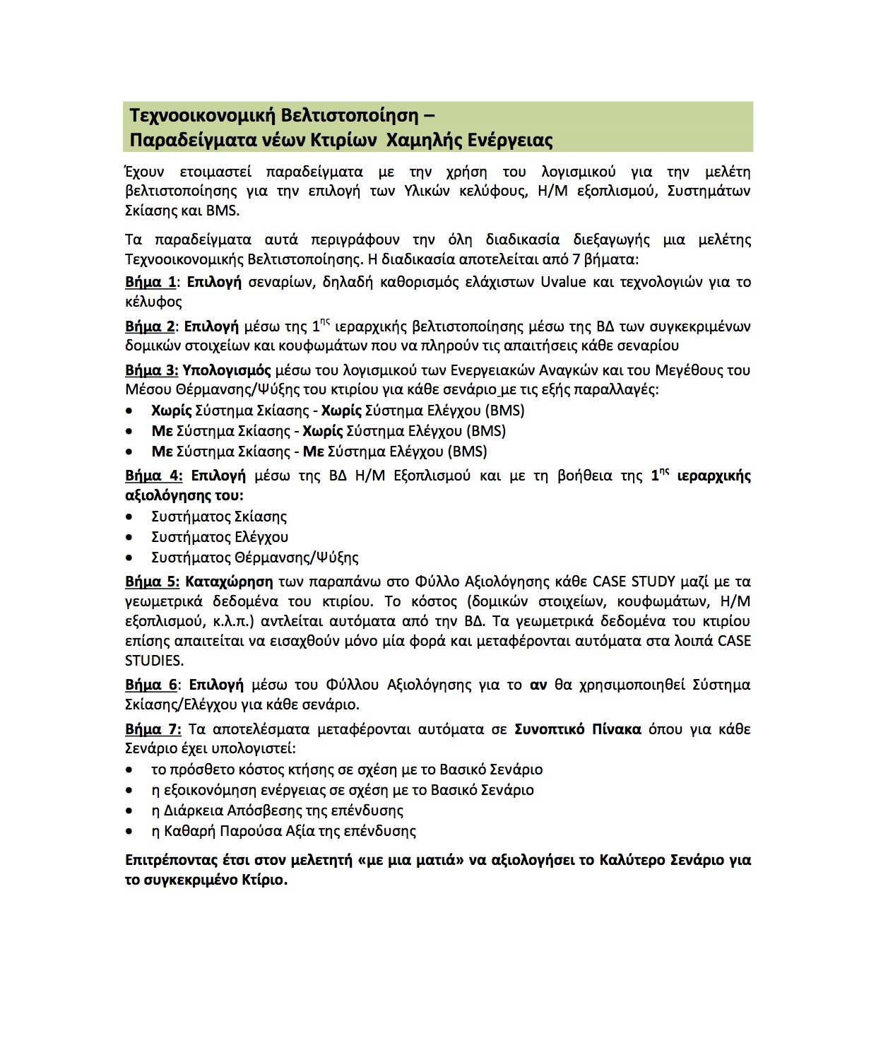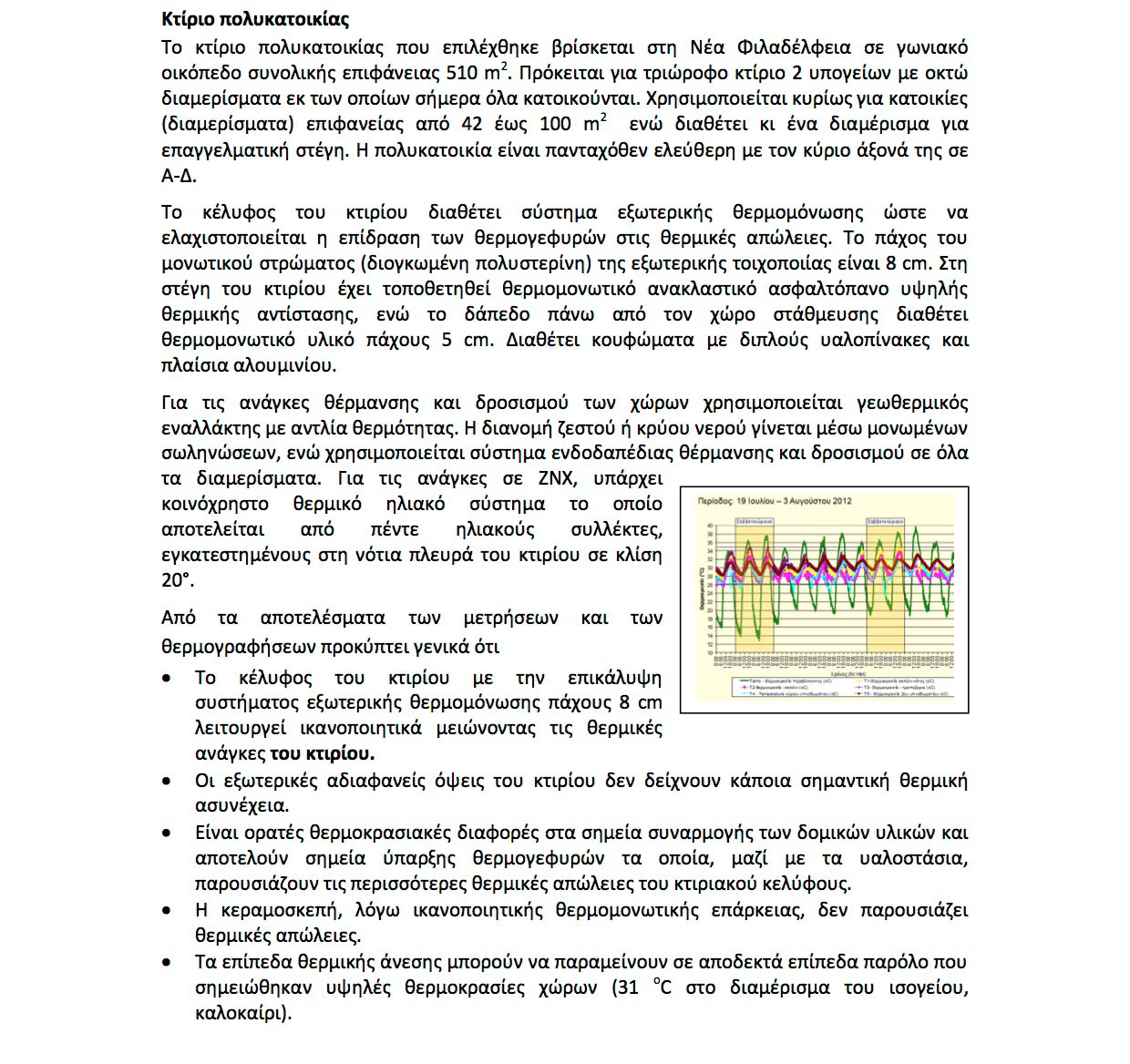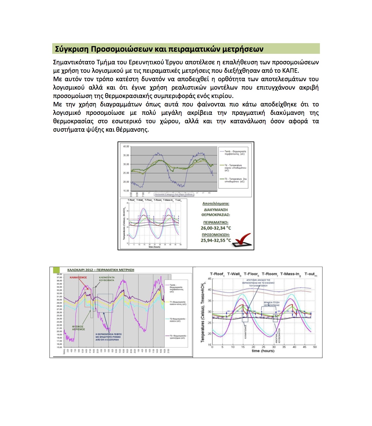με βάση την τυπική αρχιτεκτονική και τις ανάγκες της Κύπρου, χρησιμοποιώντας το παραπάνω Λογισμικό ΚΧΕ και κοστολογική σύγκριση με συμβατικές κατασκευές. Η επιλογή των παραδειγμάτων θα γίνει από την επιτροπή διαχείρισης του έργου λαμβάνοντας υπόψη τις εισηγήσεις του ΕΤΕΚ και του ΤΕΕ. Η μελέτη των παραδειγμάτων θα γίνει από τον ΣΦ1. ΠαραδοτέαΠ13: Μετρήσεις υφιστάμενων ΚΧΕ Θα περιλαμβάνονται μετρήσεις (θερμοκρασίες, θερμογραφικές εικόνες, βαθμοί απόδοσης, κατανάλωση καυσίμου, κ.α.) ενός ή δύο υφιστάμενων ΚΧΕ στην Ελλάδα (για τα οποία υπάρχουν πλήρη κατασκευαστικά και κοστολογικά στοιχεία) καθώς και η σύγκριση τους με υπολογιστικά αποτελέσματα. Π14: Παραδείγματα νέων ΚΧΕ Θα περιγράφονται αναλυτικά τα ΚΧΕ (τεχνολογικά, κοστολογικά χαρακτηριστικά) που διερευνήθηκαν και θα περιλαμβάνεται βήμα προς βήμα η εκπόνηση της μελέτης που ακολουθήθηκε για τον σχεδιασμό τους.