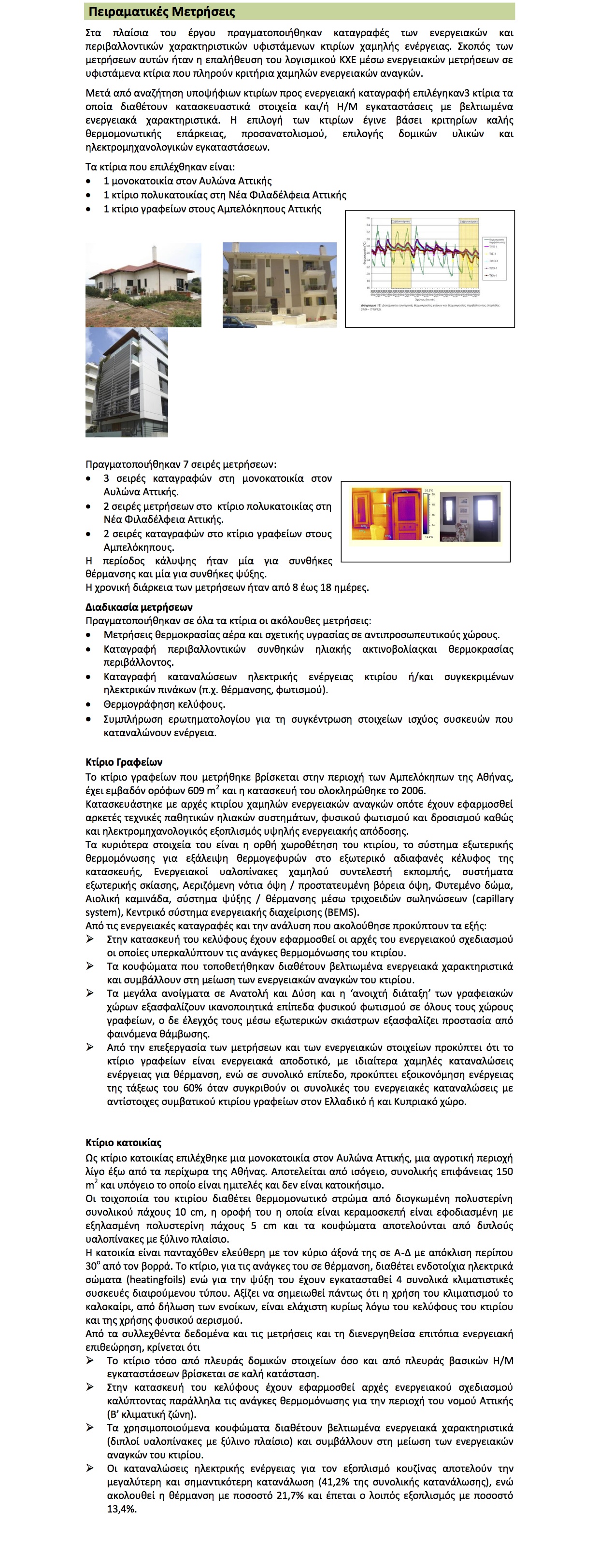 1. Σημαντικό στοιχείο της παρούσας Δέσμης Εργασίας είναι και η παράλληλη επαλήθευση του Λογισμικού ΚΧΕ με βάση μετρήσεις που θα γίνουν από τον ΣΦ2 σε διαθέσιμα ΚΧΕ στην Ελλάδα και από τον ΣΦ1 στην Κύπρο, εφόσον υπάρχουν. Στην Ελλάδα έχουν ήδη κατασκευαστεί ιδιωτικές κατοικίες/ΚΧΕ με ιδιαίτερη έμφαση στην πολύ καλή θερμομόνωση και στην μεγάλη θερμική μάζα. Για τις κατοικίες αυτές υπάρχουν όλα τα κατασκευαστικά και κοστολογικά στοιχεία, σύμφωνα με τα οποία η κατασκευή ΚΧΕ είναι απολύτως συμφέρουσα. Σύμφωνα με τους ιδιοκτήτες/κατοίκους το σπίτι θερμαίνεται τον χειμώνα με ολιγόλεπτη χρησιμοποίηση της θέρμανσης, το δε καλοκαίρι (π.χ. και του 2007 με τις υψηλότατες εξωτερικές θερμοκρασίες/καύσωνες) η εσωτερική θερμοκρασία ήταν ανεκτότατη αφήνοντας το βράδυ τα παράθυρα ανοικτά (φυσικός δροσισμός) και χρησιμοποιώντας απλούς ανεμιστήρες. Ενεργειακές μετρήσεις που μπορούν να γίνουν χειμώνα και καλοκαίρι από τον ΣΦ2, η εγκυρότητα του οποίου δεν μπορεί να αμφισβητηθεί, θα αποτελέσουν αδιάσειστο πειστήριο των ενεργειακών ιδιοτήτων ενός ΚΧΕ. Όσον αφορά στον εξοπλισμό που θα χρησιμοποιηθεί στις ενεργειακές μετρήσεις ενός κτιρίου, αυτός αποτελείται, ανάλογα με την περίπτωση, από: