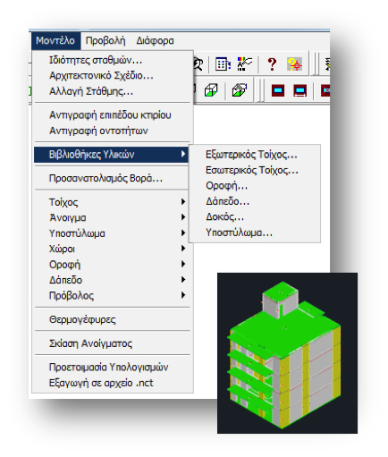 O χρήστης μπορεί να επιλέξει τα υλικά κατασκευής των δομικών στοιχείων στοιχείο (Εξωτερικός τοίχος, Εσωτερικός τοίχος, Οροφή, Δάπεδο, Δοκός, Υποστύλωμα) είτε από τις βιβλιοθήκες δομικών στοιχείων του προγράμματος είτε δημιουργώντας το δομικό στοιχείο χρησιμοποιώντας τις βιβλιοθήκες δομικών υλικών. Ο συντελεστής θεμοπερατότητας του δομικού στοιχείου υπολογίζεται αυτόματα από το πρόγραμμα.